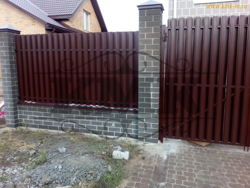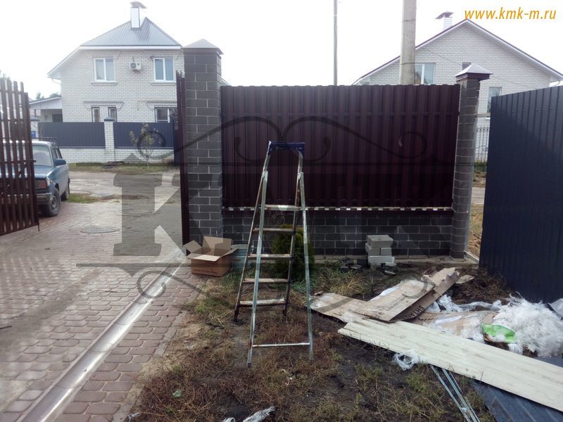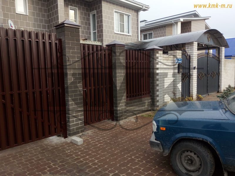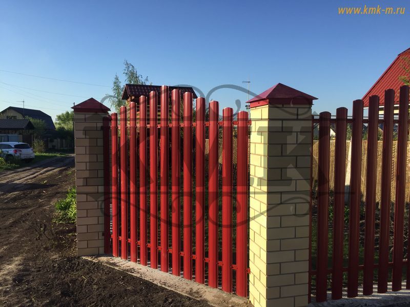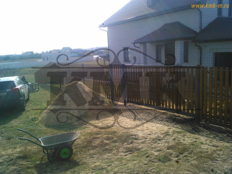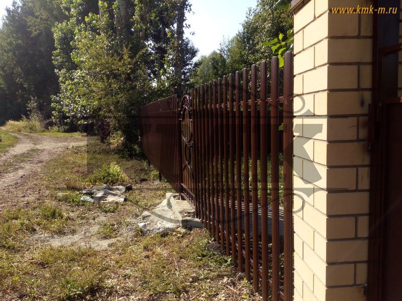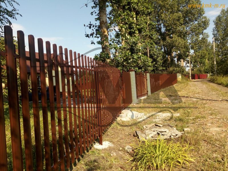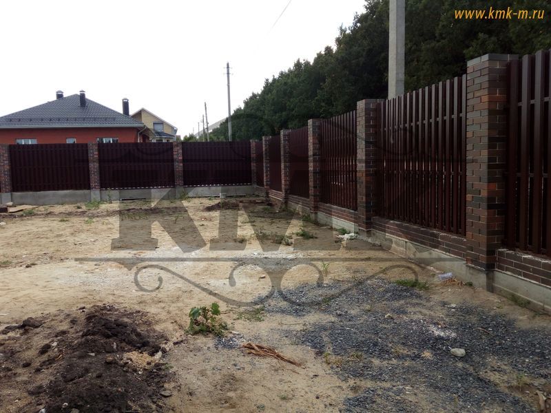 Строительство ограждения с ленточным фундаментом и кирпичными колоннами, воротами и калиткой. Секции заполнены полукруглым металлоштакетником 110 мм в дизайне Пирамида.