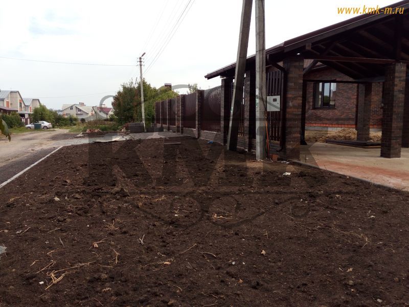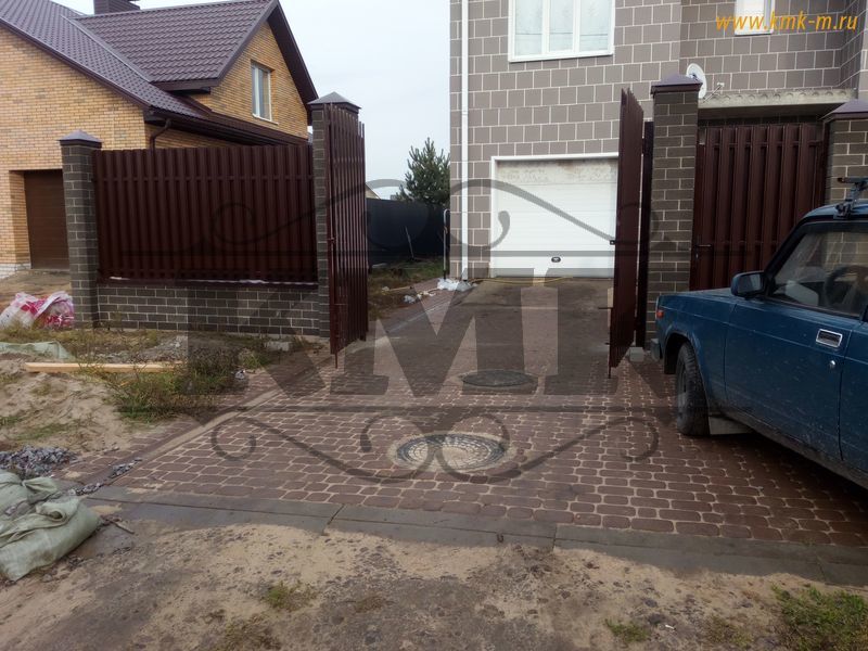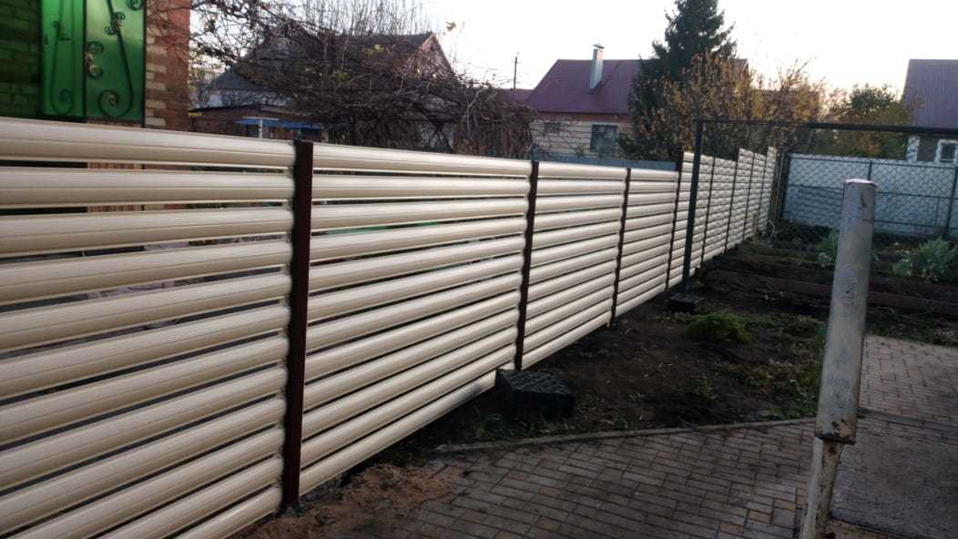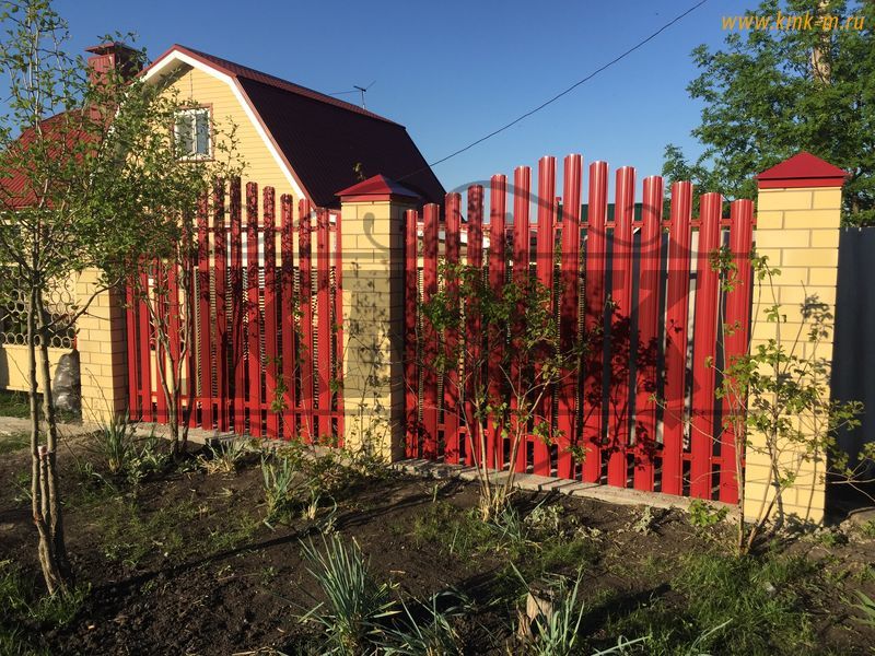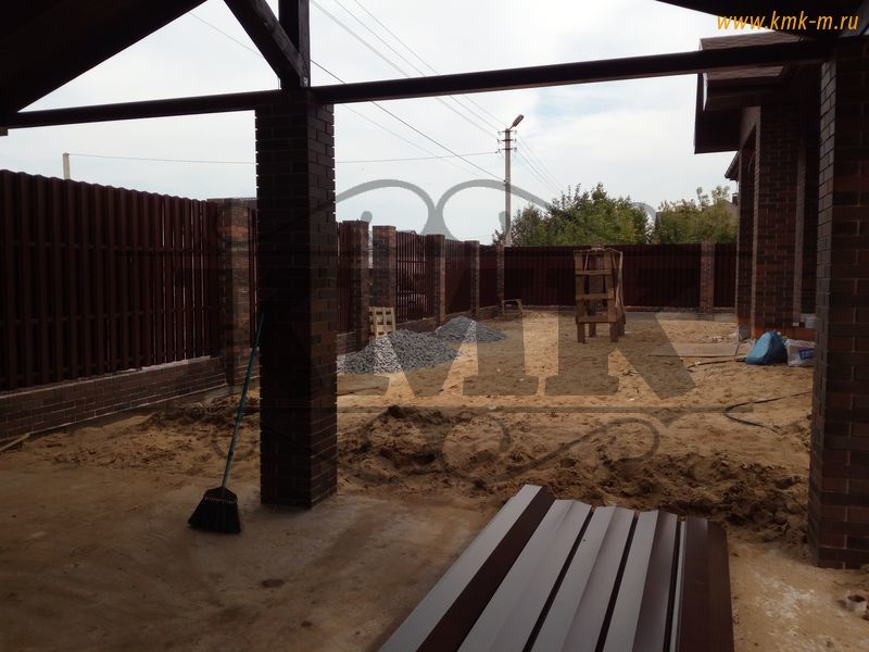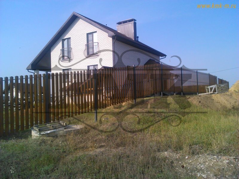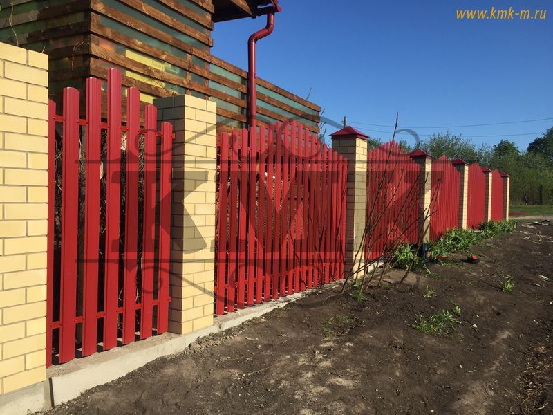 Строительство ограждения с ленточным фундаментом и кирпичными колоннами, воротами и калиткой. Секции заполнены полукруглым металлоштакетником 110 мм в дизайне Пирамида.