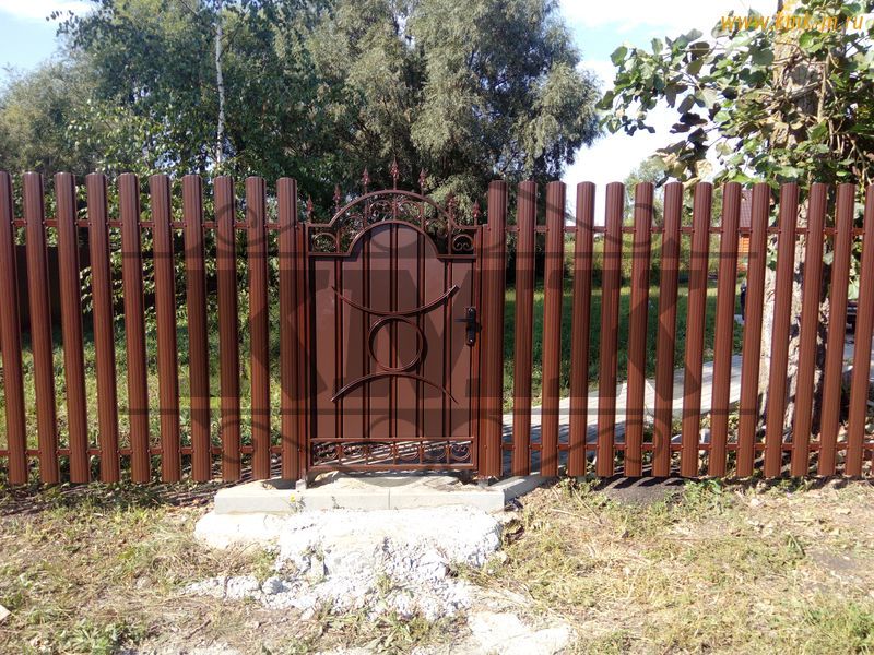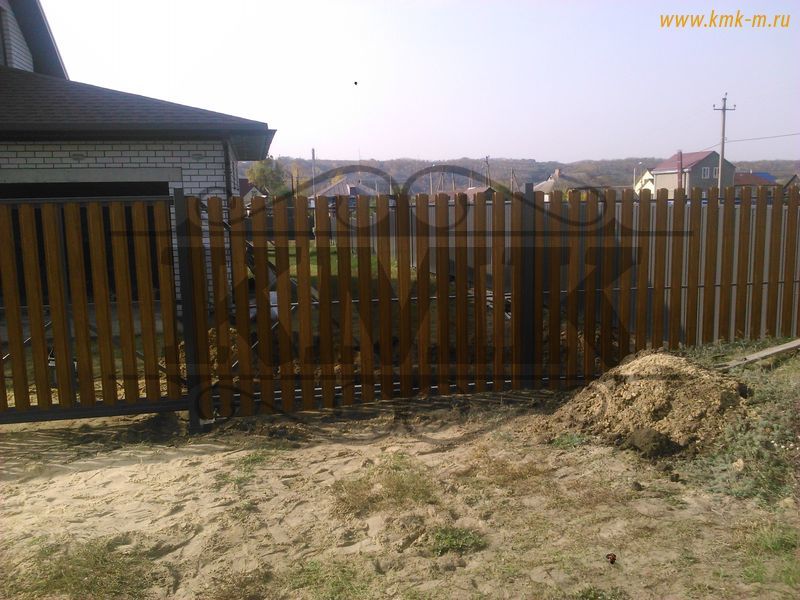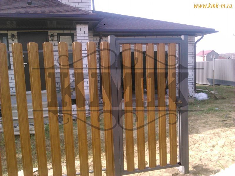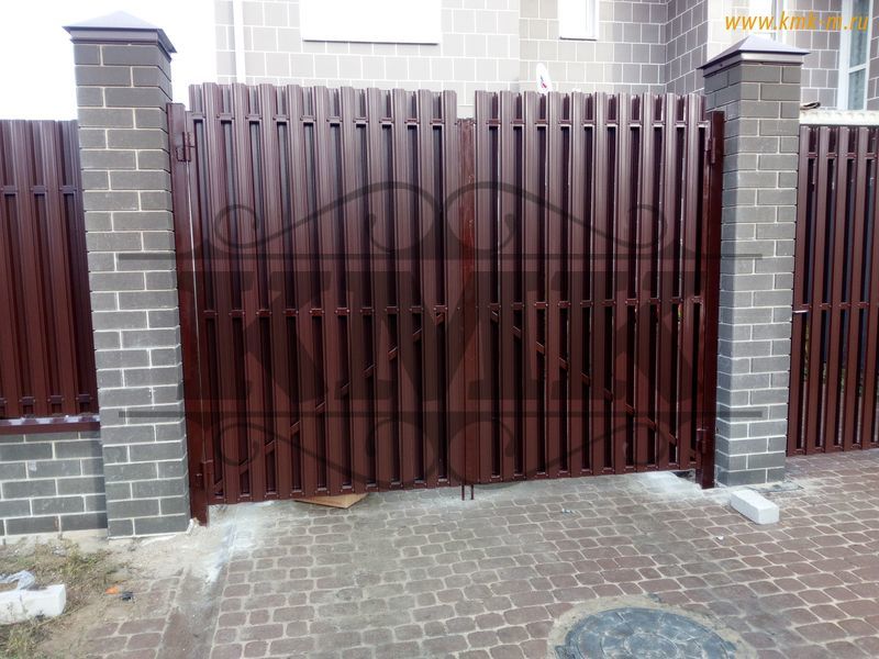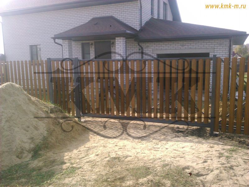 Изготовление и монтаж откатных ворот, распашных ворота и калитки с односторонней зашивкой узким металлоштакетником 85 мм.